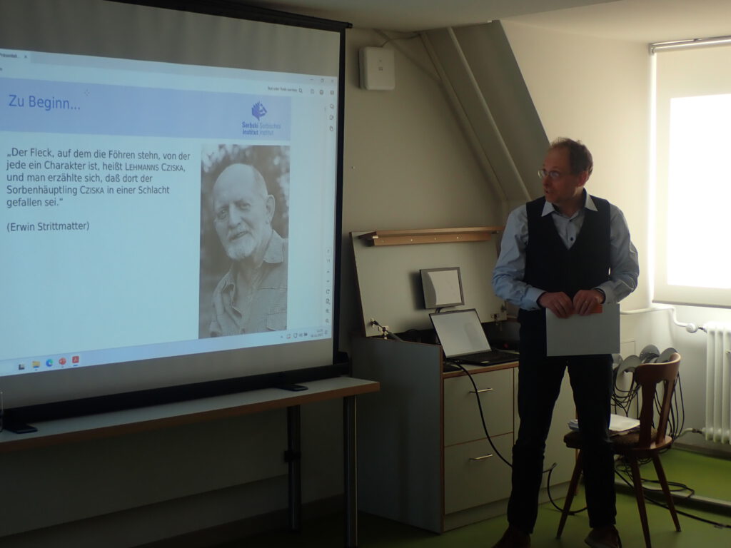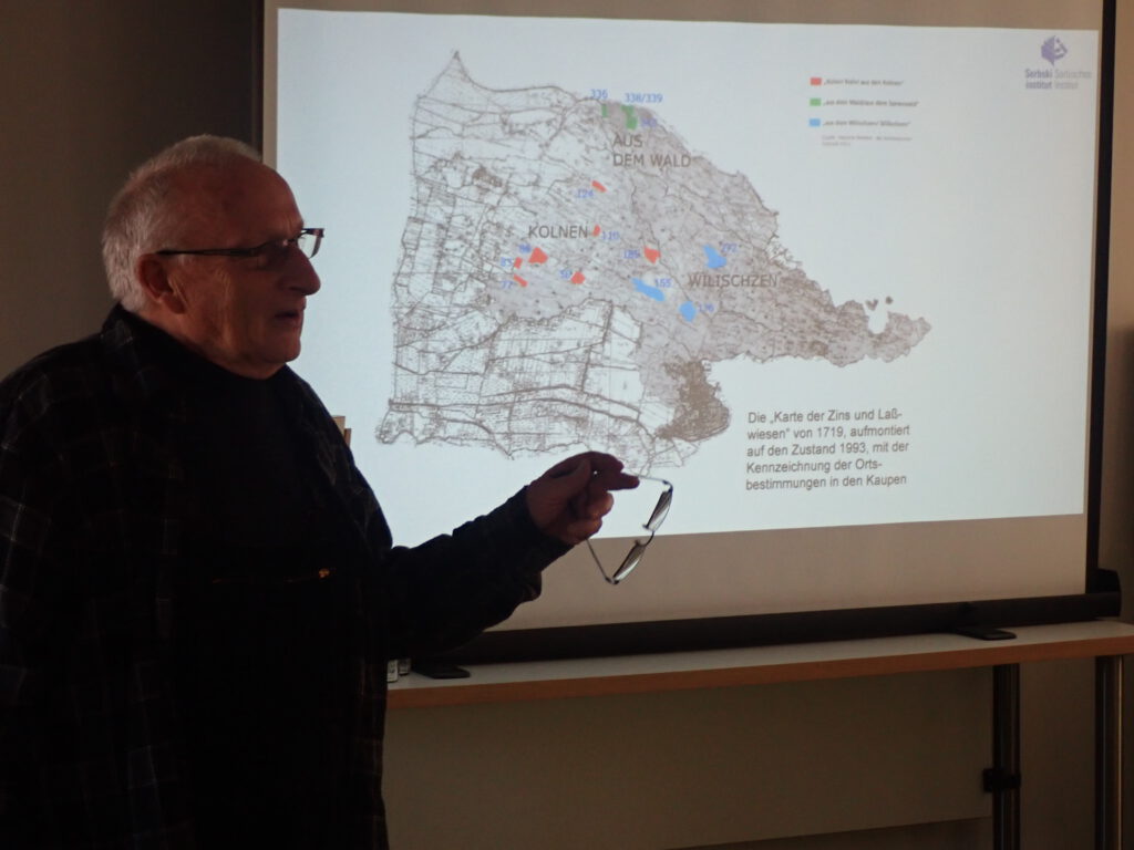 Herr Zschiechang schilderte die Geschichte, die Entwicklung der Methoden und den gegenwärtigen Stand Forschung in Bezug auf die Erfassung und Analyse von Ortsnamen, Familiennamen und Flurnamen. Er stellte Persönlichkeiten der Forschungsgeschichte vor. Besonders Friedrich Redlich wurde biographisch und als Forscher vorgestellt. Ein Schwerpunkt der Darstellung liegt darüber hinaus auf methodische Schwierigkeiten und Herausforderungen bei der Auswertung der Quellen. Es wurden in der Vergangenheit bevorzugt die Kooperation mit vor Ort wirkenden Akademikern wie Lehrern und Pfarrern bei der Dokumentation gesucht, was auch zu Kooperationsschwierigkeiten führen konnte.